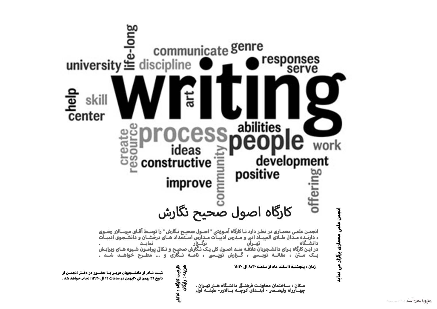 کارگاه اصول صحیح نگارش با حضور 17 نفر از دانشجویان رشته ی معماری در روز پنج شنبه 1 اسفند ماه برگزار گردید .